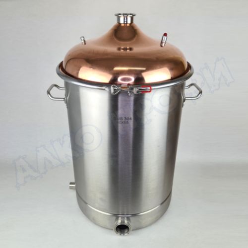Перегонный куб из пищевой нержавеющей стали AISI 304 кастрюльного типа с крышкой из меди отечественного производства. Используется с дистилляторами (самогонными аппаратами) в качестве емкости нагрева спиртосодержащих жидкостей.